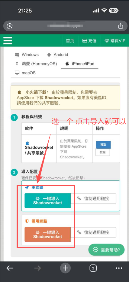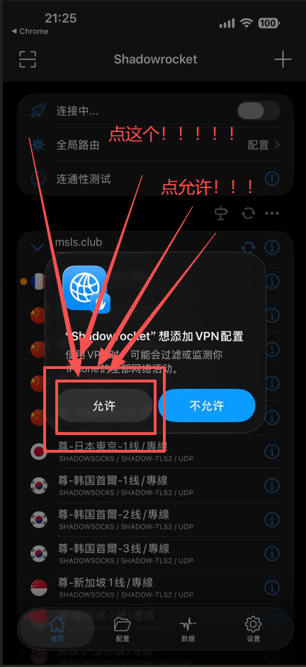 💡 提示: 系统会自动跳转打开 Shadowrocket,请点击"打开"或"允许"。如果无法跳转,请点击"复制链接",然后手动在软件中添加。